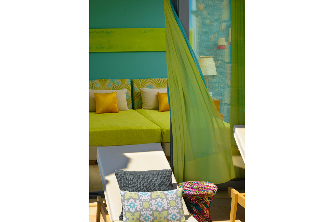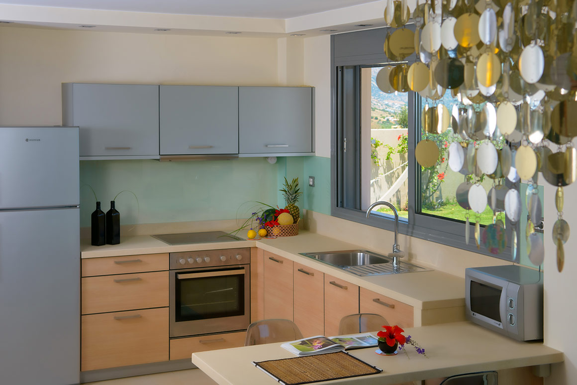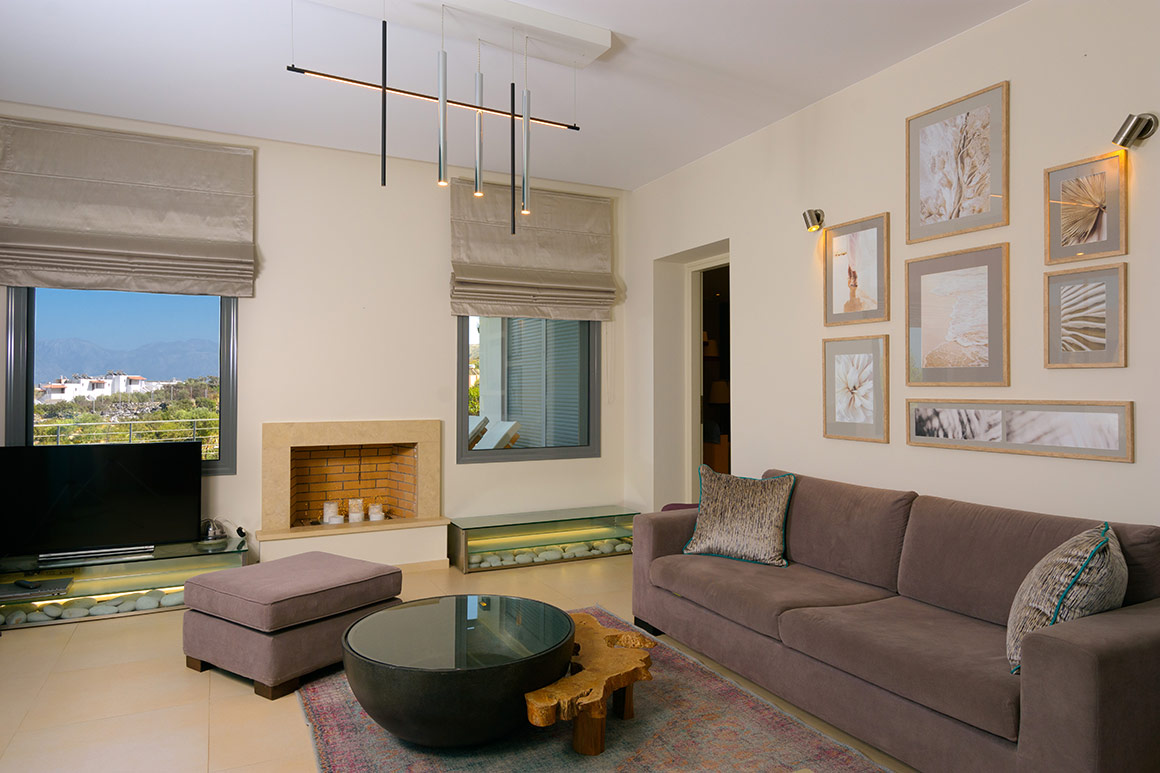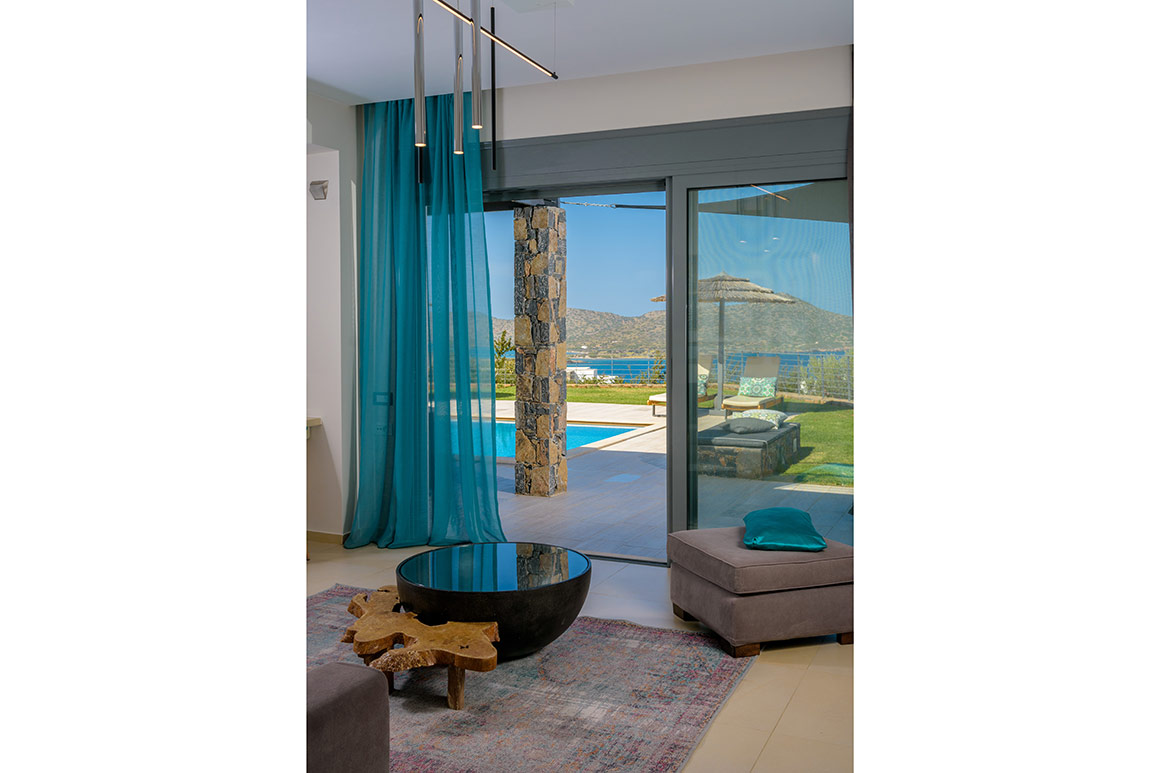 The interior décor of the Notos Villa Elounda Crete is very sophisticated and the walls are painted in soothing colors harmoniously blending with the relaxing environment.